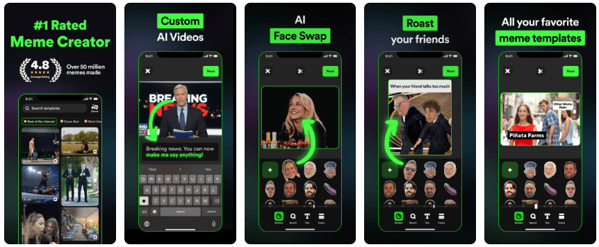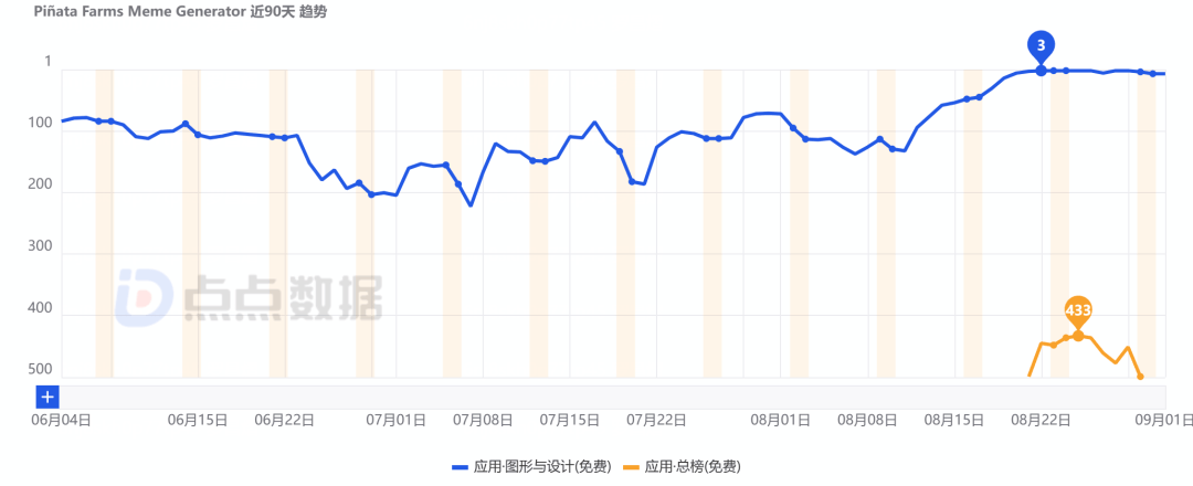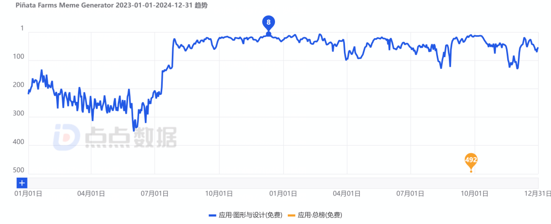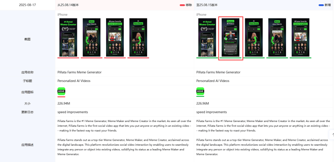 而正在此后8月15日的版本更新中,同时对详情页的首图进行变动,《Piñata Farms Meme Generator》正在八月共进行了8次版本更新,使用产物落地往往呈线性推进形态,再到基于AI视频生成升级功能的《Piñata Farms Meme Generator》。